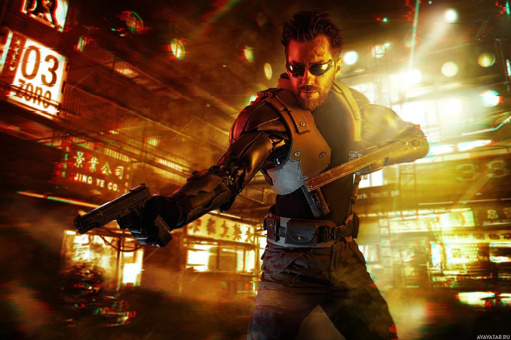 the video game "Deus Ex," which is known for its immersive cyberpunk themes and futuristic setting. The character depicted here is likely an agent or operative, given their attire that includes