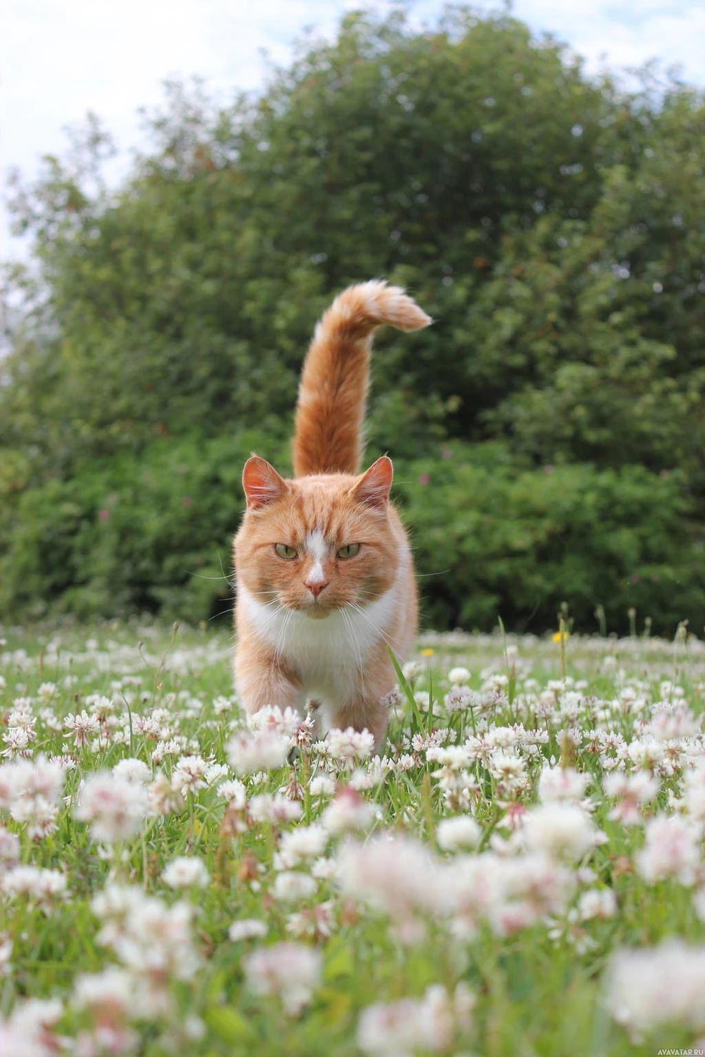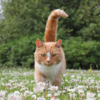 The picture shows a cat with an orange and white coat, walking through what appears to be a field of wildflowers. The cat has one ear perked up as if listening or observing its surroundings.