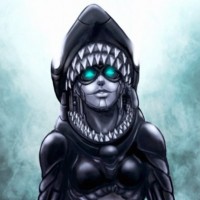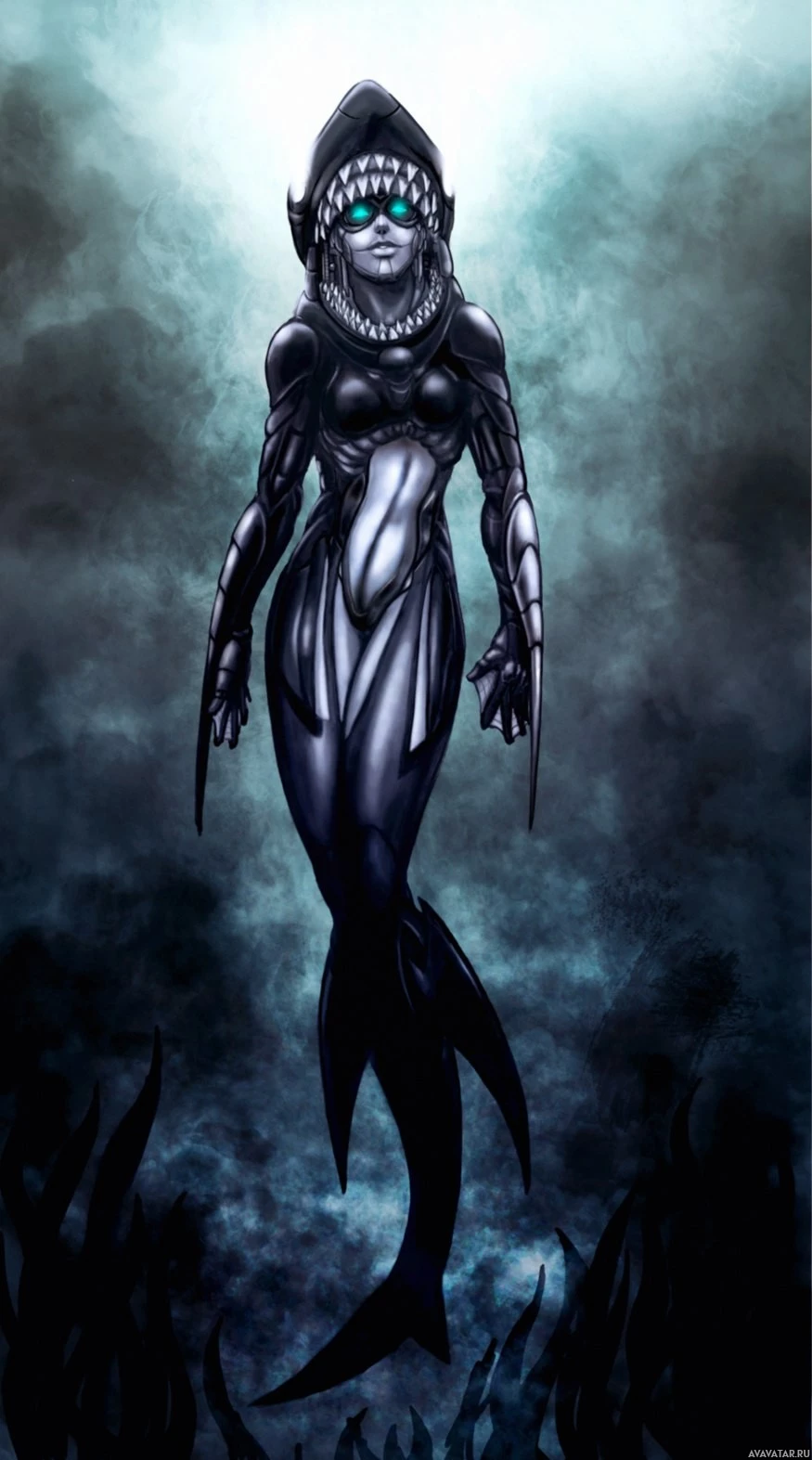 The image depicts a character that appears to be a hybrid between a human and a shark, often referred to as a mermaid in