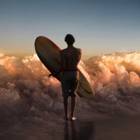 the warm light in the sky. He is holding a surfboard and looking out towards the ocean. In the background, there are fluffy clouds that add to
