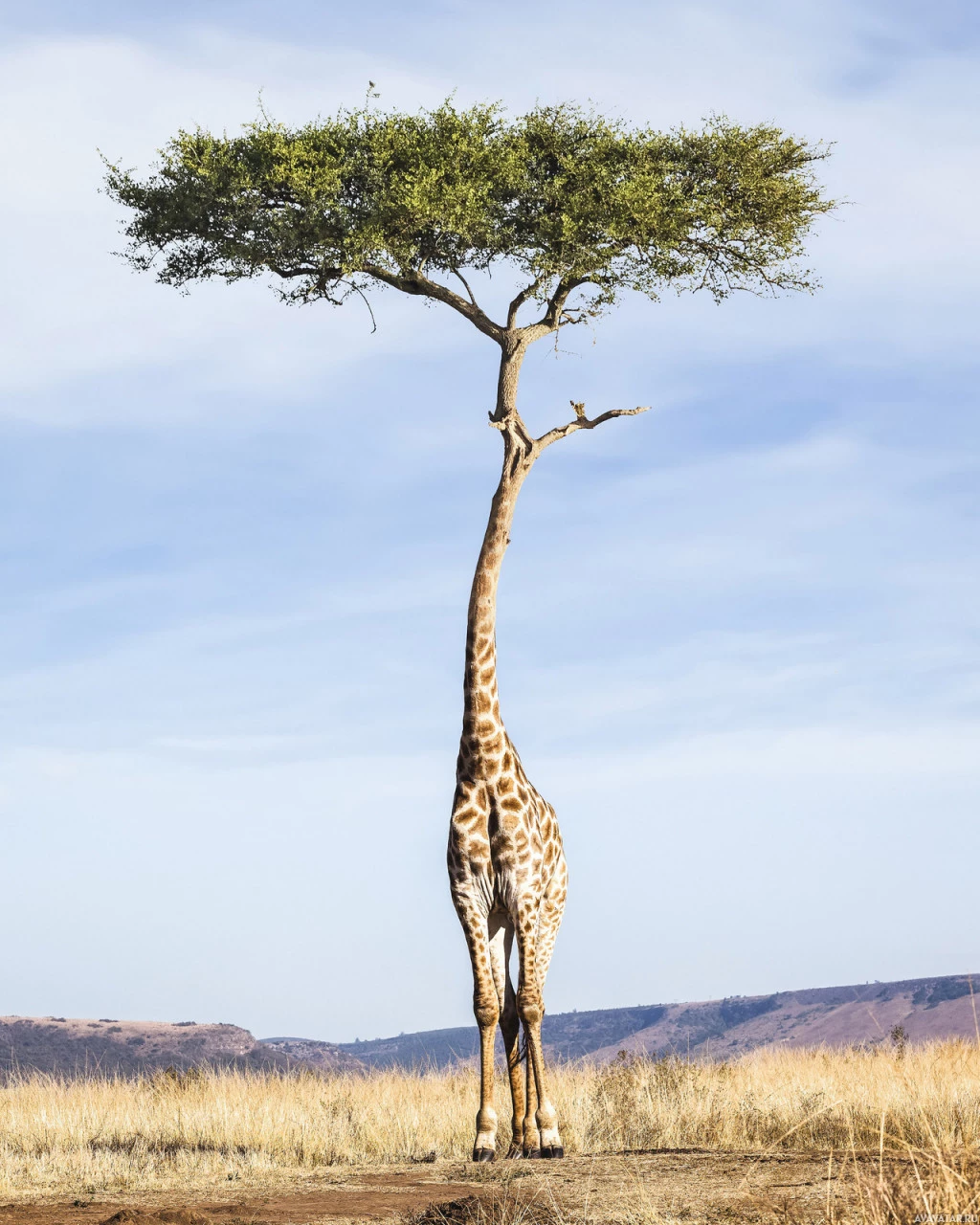 The image features an animal, specifically a giraffe. There is also a tree in the picture, which appears to be a typical African acacia tree, known for its characteristic flattened canopy and