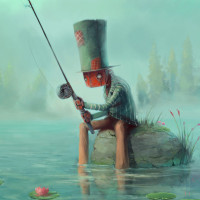 the fishing rod it is holding with both hands. The robot has a hat and is wearing what looks like