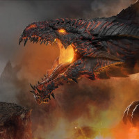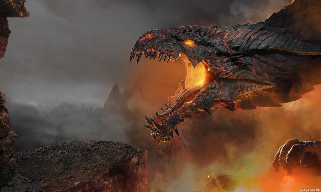 sharp teeth, its body coiled around what appears to be a volcanic eruption or some kind of fiery destruction. There are also smaller figures that could represent humans or other creatures being confronted by the dragon's rage. The background suggests an apocalyptic environment with clouds, smoke, and rocks contributing to