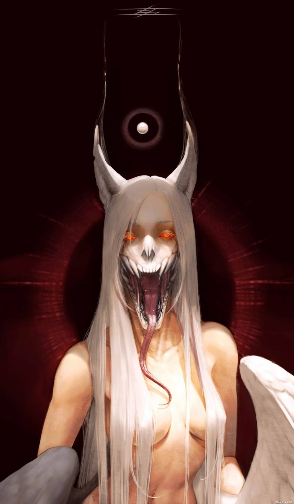 red eyes. There's an ominous red circle in the background that adds to