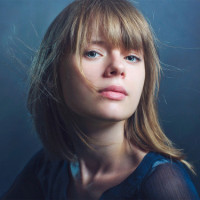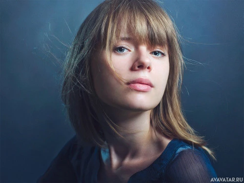 The picture features a young woman who appears to be looking into the distance with a thoughtful expression. Her hair is styled short, and she has a gentle look on her face. The background is dark, possibly black or very dark blue, which creates a dramatic contrast with her fair complexion.