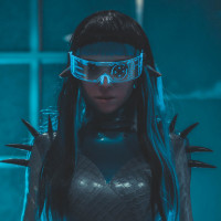 lighting tone. The individual is wearing a full-body silver suit that has spikes and a metallic texture, which could suggest