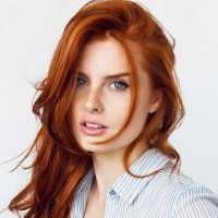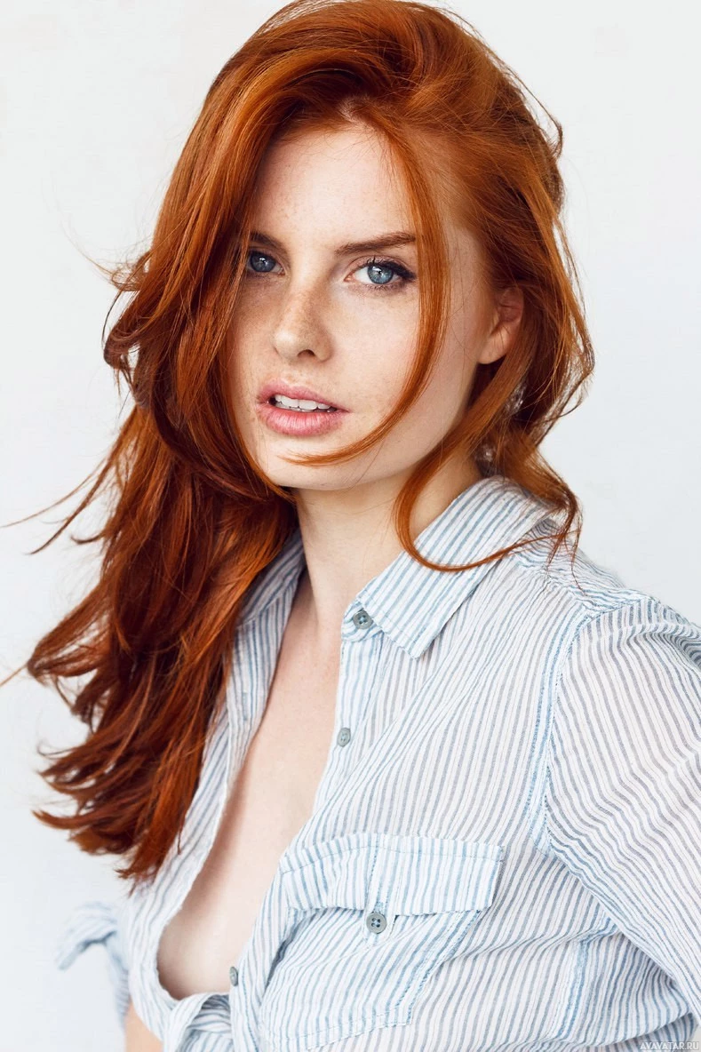 a young woman with red hair and fair skin. She is wearing what appears to be a button-up shirt, possibly denim or cotton fabric given the texture visible in the photo. Her expression is neutral to slightly contemplative, and she seems to have
