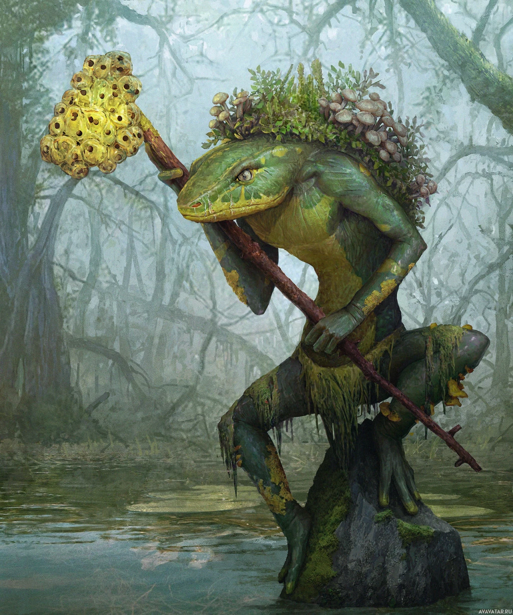 a fantasy scene featuring an anthropomorphic frog creature. This creature has human-like arms and is sitting on one leg, holding what appears to be