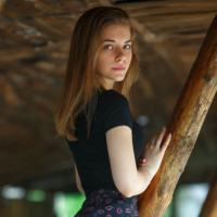 a young woman standing in what appears to be an outdoor setting with wooden structures. She has