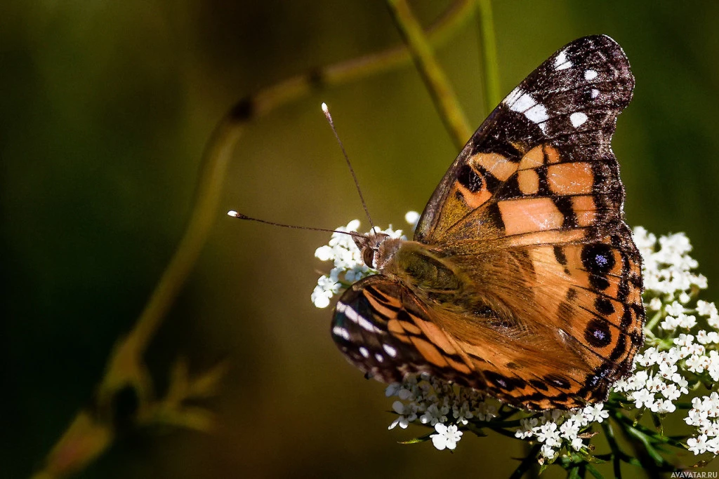 white petals and green stems. The butterfly's wings have a pattern of orange, black, and white colors, typical of