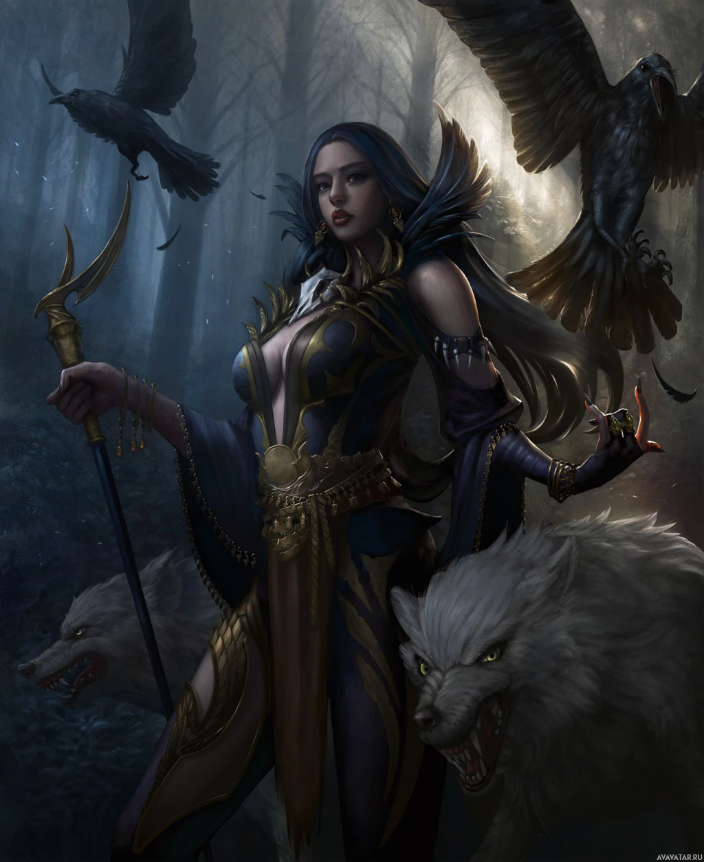 large birds—two crows and one eagle—flying in the air, giving the impression that they serve as her companions or familiars. On either side of the character are wolves; one on the left side is growling and appears to be menacing, while the wolf on the right is more passive, observing the scene. The background consists of misty forest scenery with trees and