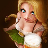 На картинке изображен анимированный персонаж, который выглядит как блондинка с большими голубыми глазами, держащая бокал пива. Она носит то, что похоже на традиционную баварскую одежду, которая включает в себя платье и шорты. На фоне темно, выделяется персонаж и ее напиток.