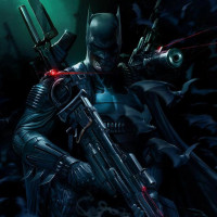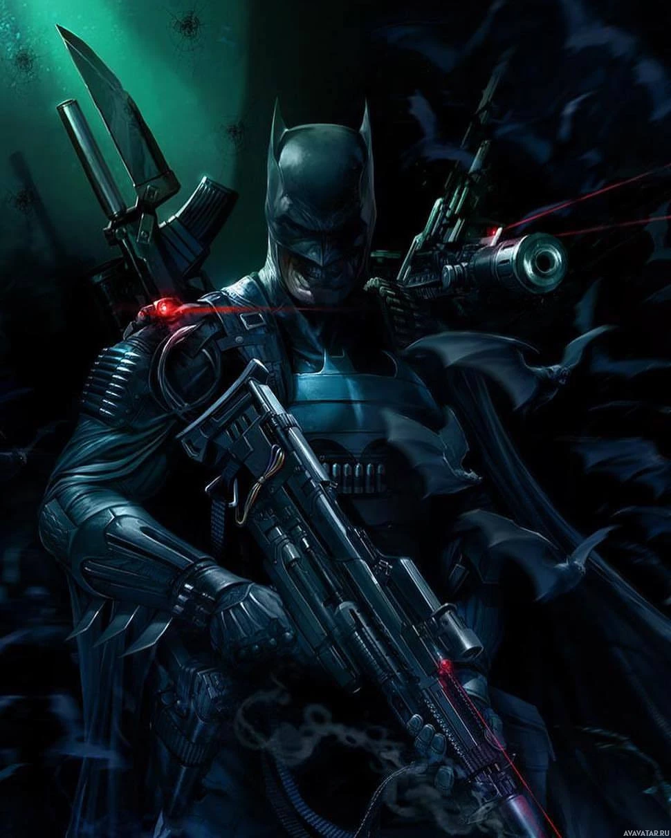 The image depicts a character known as Batman. He is dressed in an armored suit with various gadgets and weapons, which are typical for his