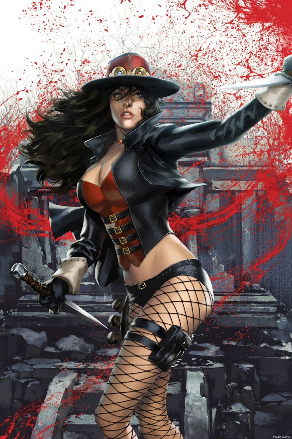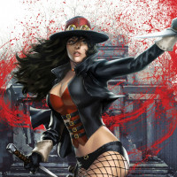 dark hair and is wearing a black leather jacket with red accents. In her left hand, she holds what appears to be a gun. Her right hand is not visible in the frame, but it's likely holding onto another weapon or object based on her attire. The background suggests an urban or industrial setting with textured walls and