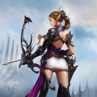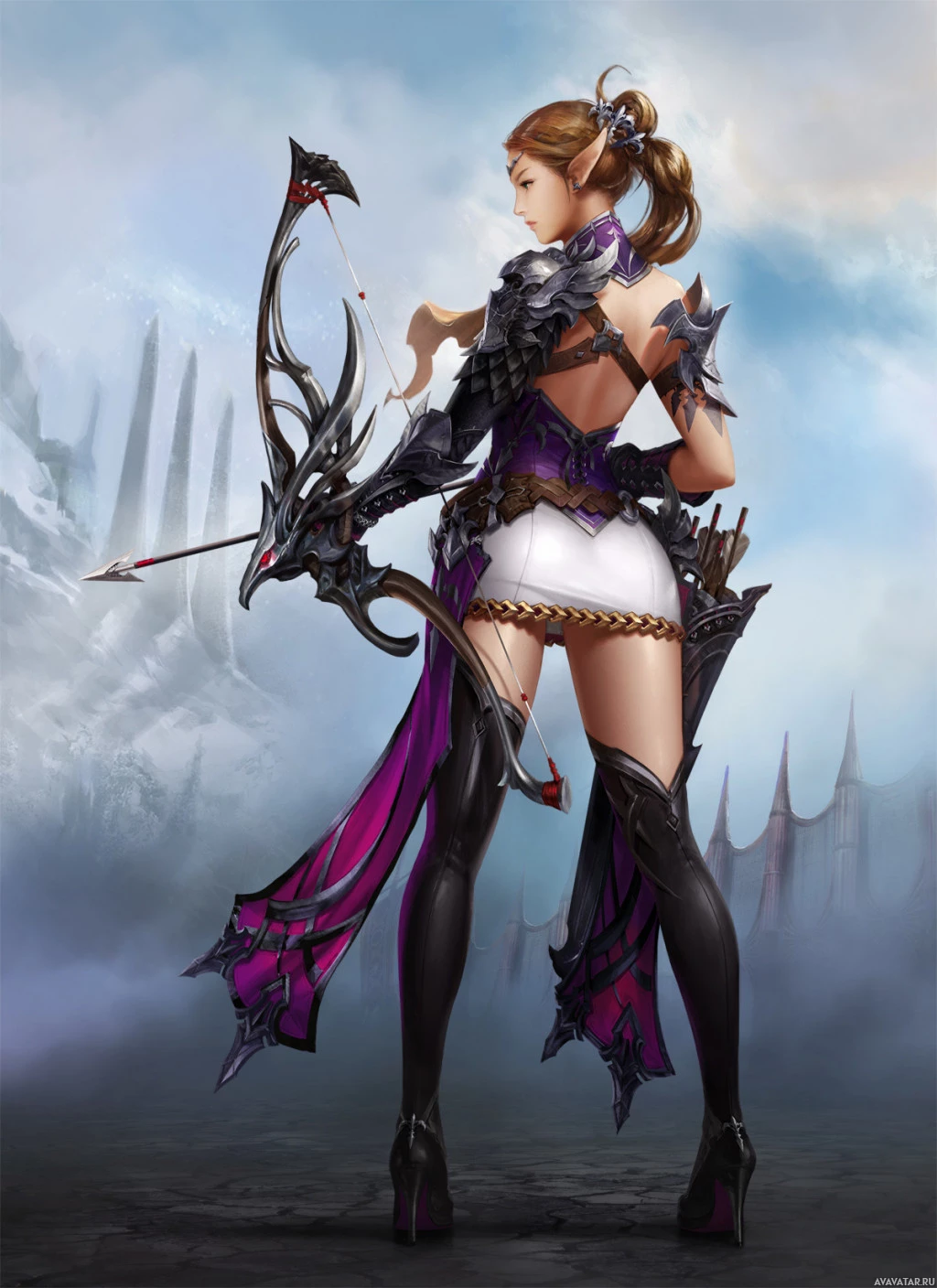 an elf character. The elf is depicted from behind, holding a bow and seemingly ready for combat. The character has an intricate outfit with