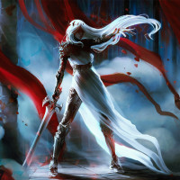 white hair and is holding a sword in one hand, suggesting she may be engaged in combat or preparing for battle. The background features what looks like flowing