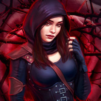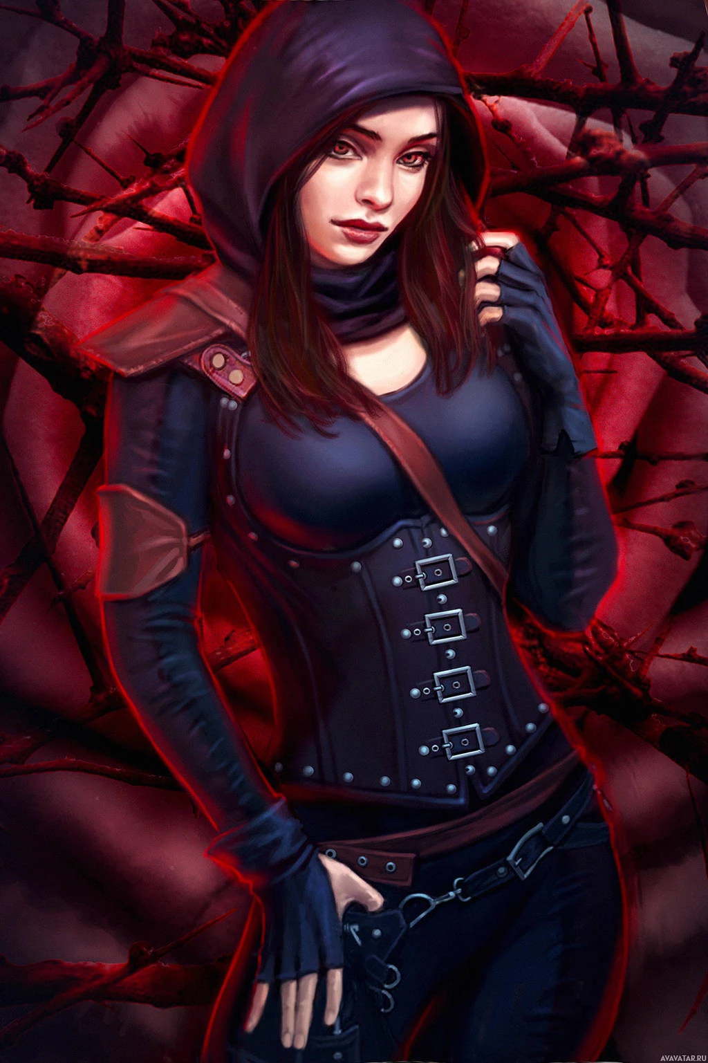 a dark outfit with a hood, resembling an assassin or thief archetype. The background suggests a grim or sinister environment, possibly indicating a setting related to danger or mystery.