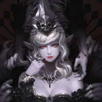 white hair and is wearing dark, elaborate clothing that could suggest a demonic or evil theme. There are gothic elements in the background, like
