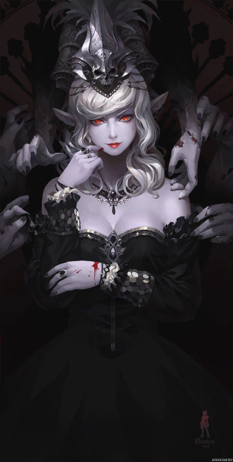 the fantasy genre, possibly representing a drow, which is a fictional race known from various fantasy stories, most famously in the Dungeons & Dragons role-playing game. The style of the artwork indicates it could be inspired by or associated with games or literature that feature such themes.