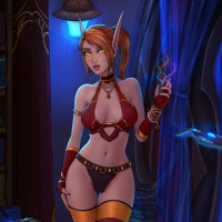 an animated character who appears to be a fantasy-themed female elf. She has reddish hair, pointed ears, and is dressed in attire that suggests she might be a sorceress or enchantress, given the bookshelves with books in the background, which could imply magical or