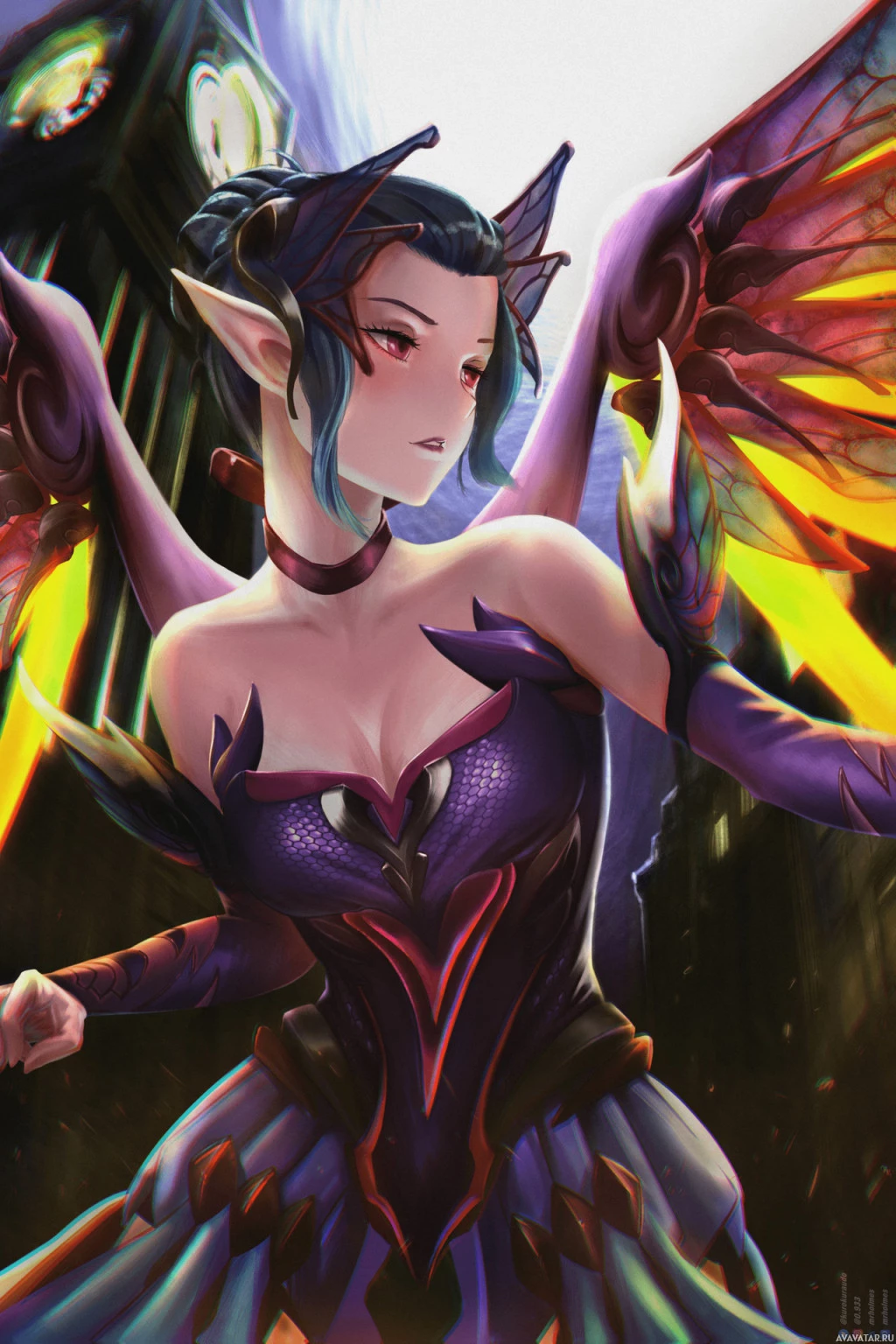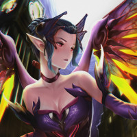 purple hair, pointed ears, and is adorned in a dark outfit with red accents that resemble flames or fire. Additionally, there are wings attached to her back, which further emphasize the mythical or demonic aspect of her appearance. The setting appears to be a dimly lit environment, possibly