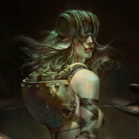 flowing hair and is wearing elaborate armor or body pieces that are intricately designed. There are mechanical or robotic elements incorporated into her attire, suggesting she might be a warrior or a character from