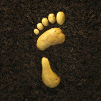 The image shows a collection of potatoes arranged to resemble a human footprint. This is not an actual footprint, but rather an artistic or symbolic representation created by the arrangement of potatoes.