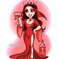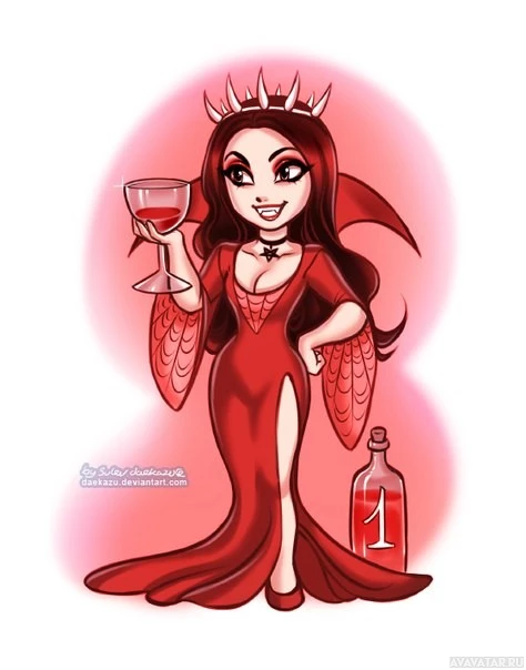 a cartoon character dressed as a vampire, wearing red clothing with wings and a crown. She is holding a glass of wine and has