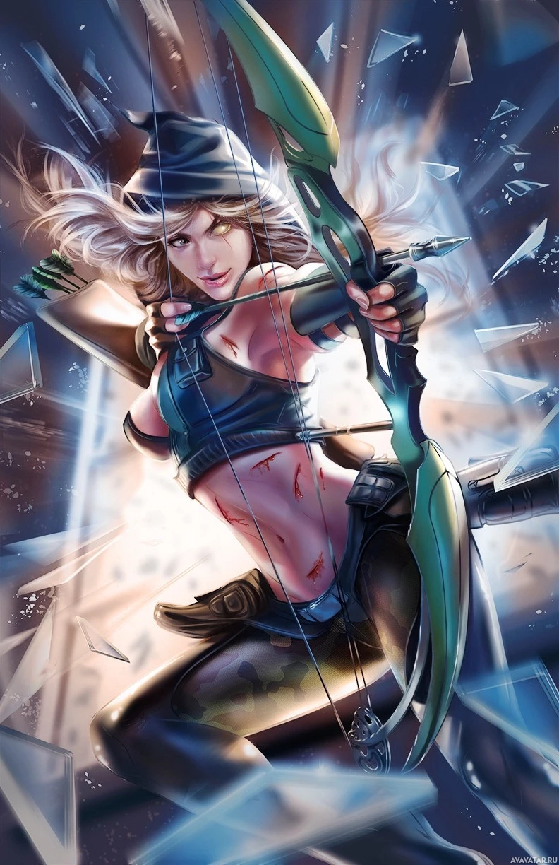 blonde hair and is wearing a black hooded top with the hood up, which suggests she might be a figure from folklore or mythology known for her prowess in archery. The bow she holds is prominent, indicating her skill as an archer. Her expression is intense, and she's looking off to the side, possibly aiming at something out of frame. The background has splashes of blue that could represent ice or a frozen environment, fitting with