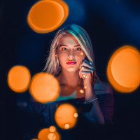 a neutral expression on her face. The background is dark, which contrasts with her lighter hair color, making her stand out as the main subject of the image. Additionally, there are small orange circular lights floating around her head, creating