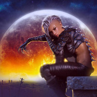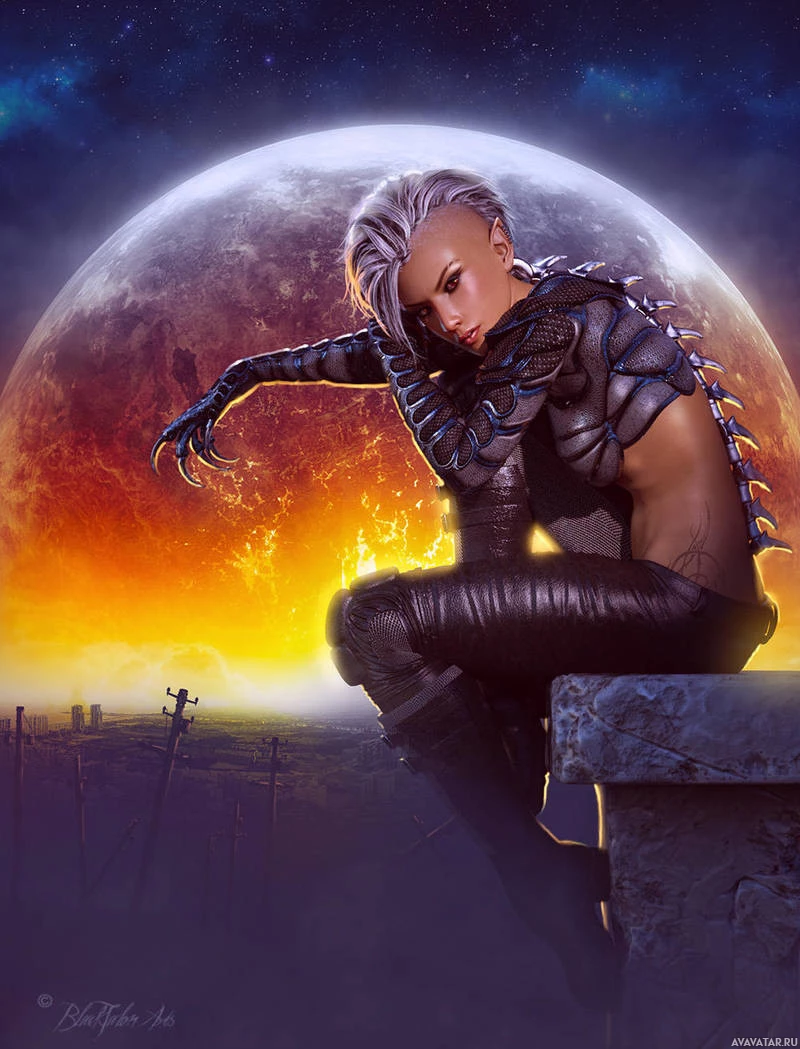 striking hair and is positioned in front of a dramatic backdrop that includes a moon, a red sky, and what appears to be an alien landscape with barren ground and distant structures. The overall effect suggests a scene from