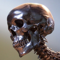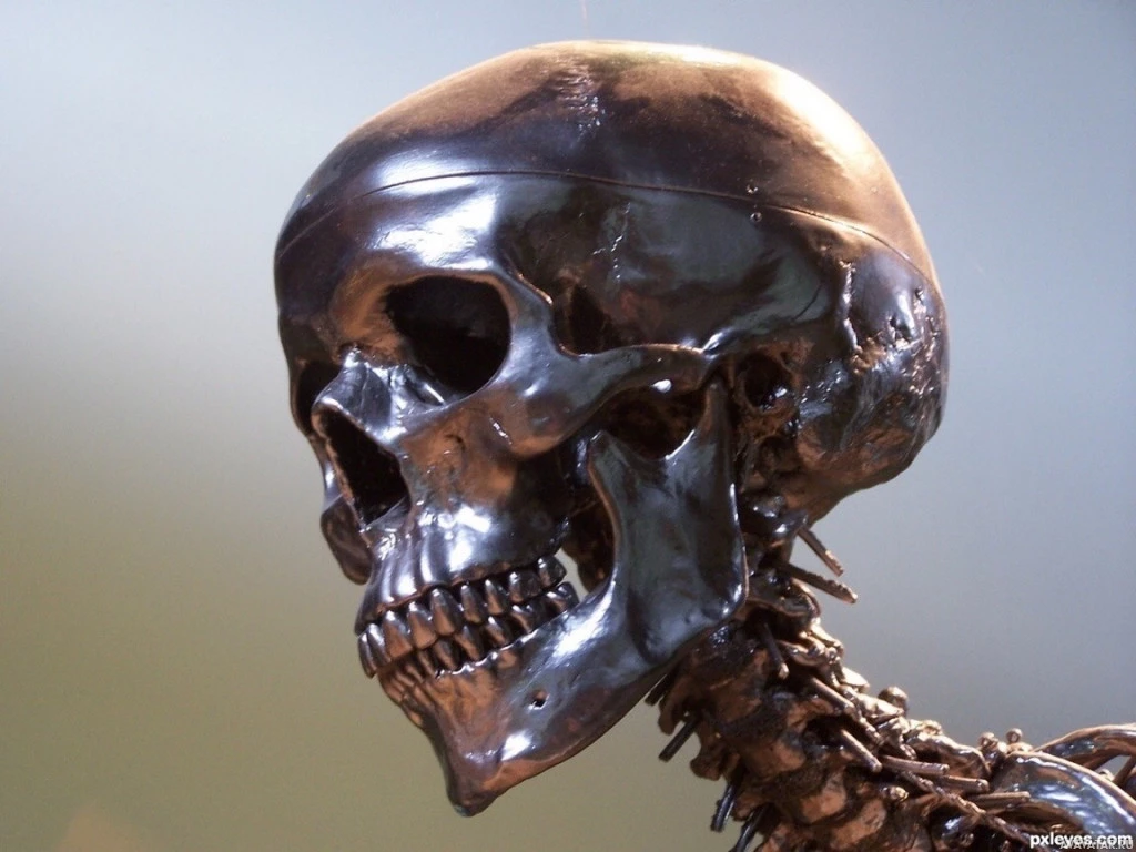 The image displays a skull, which is likely a sculpture or artwork. It appears to be metallic and has been crafted with