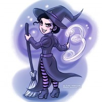 a black hat with a pointy tip and has a broomstick in one hand, which is a common accessory for witches in fantasy media. The background features stars and