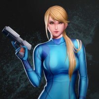 a female character wearing a blue and white power suit, which is reminiscent of the iconic armor from the "Metroid" video game series. She is holding a pistol, which is also commonly associated with the games featuring her character. The character's pose and expression suggest confidence and readiness, typical of the action-adventure genre in which she appears.