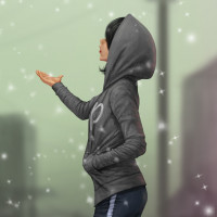 a grey hoodie with the letter "P" on it, suggesting it might stand for something like "Planet." The setting seems to be a snowy street scene, possibly in
