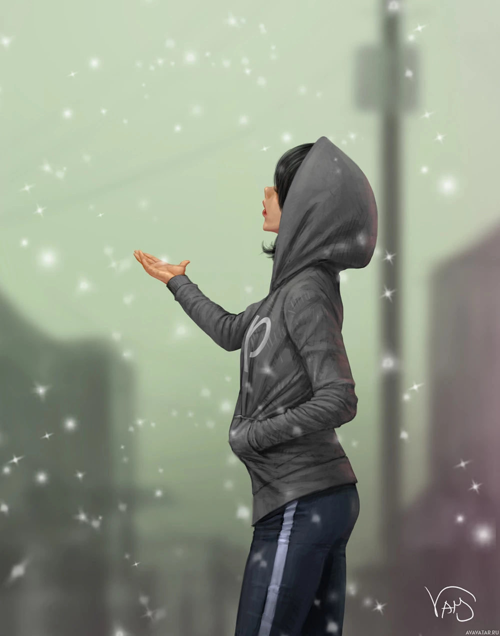 a slight blur over the image, giving it a dreamlike quality or perhaps representing falling snow. The overall atmosphere is one of contemplation or introspection, as the character appears to be looking up at something that isn't visible in the picture, possibly indicating