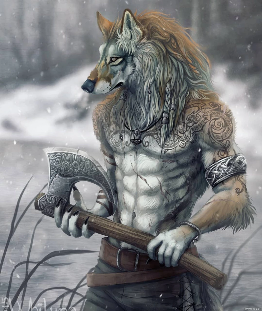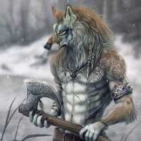 an anthropomorphic figure that appears to be a combination of human and wolf characteristics. It is standing upright, holding what seems to be an axe in its right hand. The figure has fur, pointed ears, and