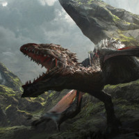 Картинка показывает фантастическую сцену с драконом в качестве центрального персонажа. Дракон, кажется, расположен на некоторых скалах среди природного ландшафта, возможно, в горной местности. Общая атмосфера картины предполагает, что это может быть фильм или видеоигра, связанная с жанрами фэнтези, где часто появляются такие мифические существа.