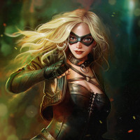 a female character wearing what appears to be a black and gold costume, reminiscent of a superheroine's attire. The character has long
