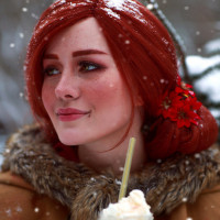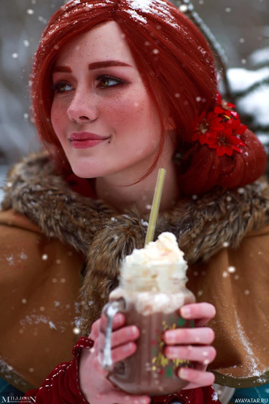 Triss Merigold from the "The Witcher" game series, smiling and holding a frothy beverage. They are wearing costume elements that resemble her attire in the game, such as