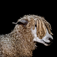 The image shows a sheep with a distinctive hairstyle that resembles dreadlocks. This is an unusual and whimsical appearance for a sheep, as they typically do not have long locks of hair hanging down. The picture seems to be a playful or artistic representation rather than an actual scene from life.