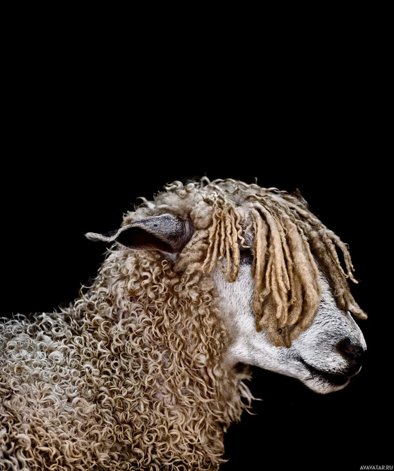 На картинке изображена овца с характерной прической, напоминающей дреды. Это необычный и причудливый вид для овец, так как у них обычно нет длинных замков волос, свисающих вниз. Картина кажется игривым или художественным представлением, а не реальной сценой из жизни.