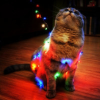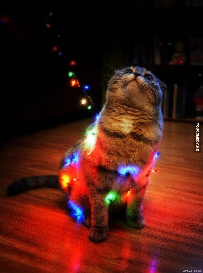 На картинке изображена кошка, украшенная нитями красочных огней, которая напоминает праздничную гирлянду или рождественские огни. Кошка сидит на деревянном полу. В кадре нет людей или других животных.