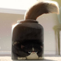 The image features a cute animated cat sitting inside a transparent glass jar with a white label on it. The cat appears to be peeking out of the jar, which adds to the whimsical and fun nature of the scene.