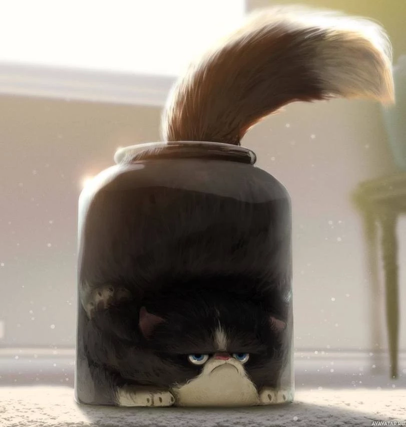 На картинке изображен милый анимированный кот, сидящий внутри прозрачной стеклянной банки с белой этикеткой на ней. Кошка, кажется, выглядывает из банки, что добавляет причудливой и веселой природе сцены.