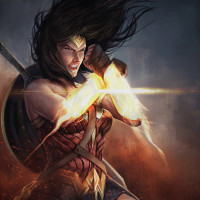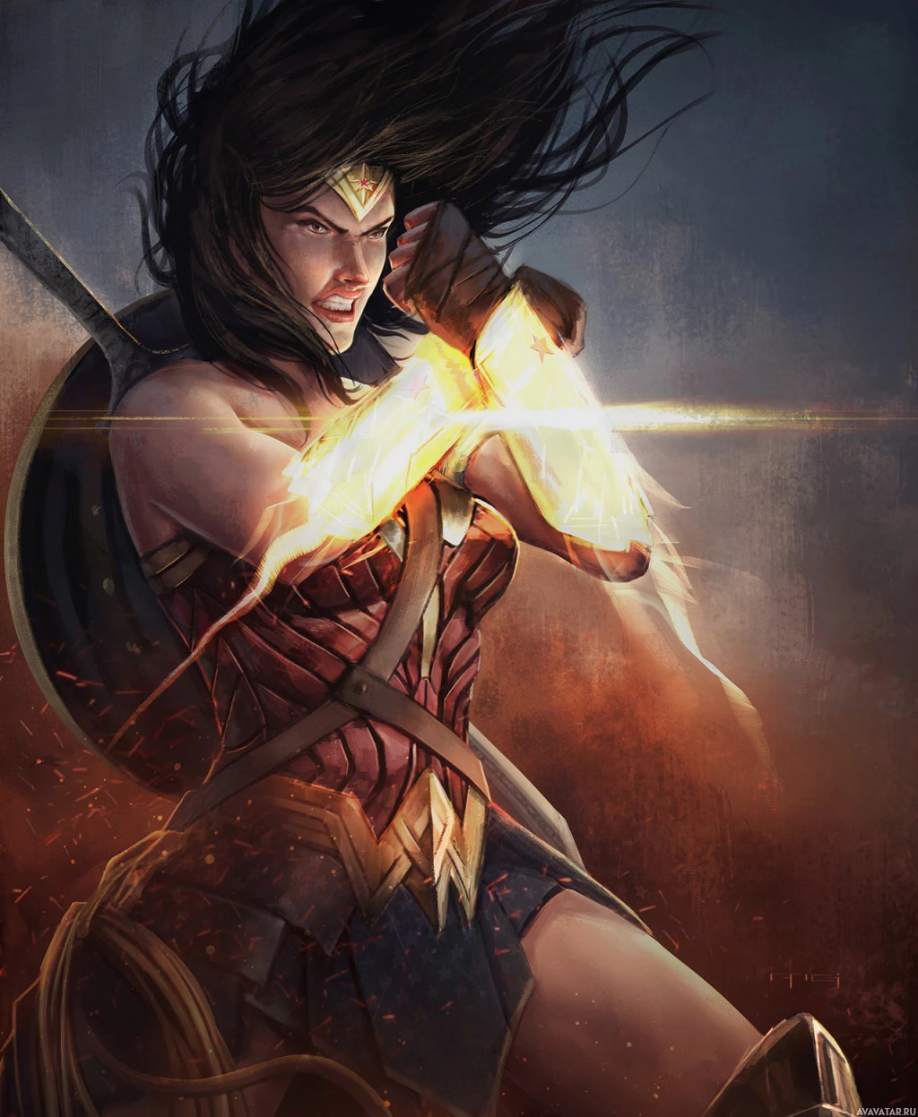 action stance, suggesting that she might be fighting against an enemy or defending someone or something. The artwork captures her strength and heroism, which are central themes associated with her character.