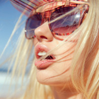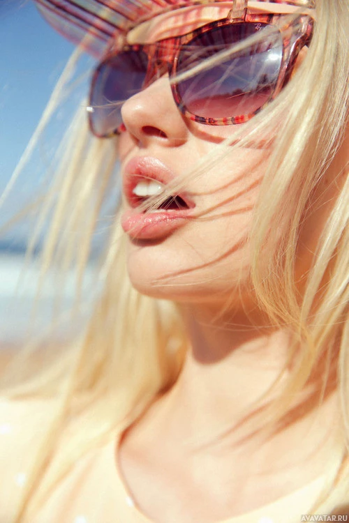 blonde hair. She is wearing sunglasses and has her mouth slightly open as if she's speaking or reacting to something. Her hair looks windblown, suggesting that the photo was taken outdoors on