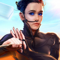 a female character who appears to be from a science fiction setting. She is wearing armor and has cybernetic or robotic enhancements, suggesting she might be part of an advanced civilization or military force within