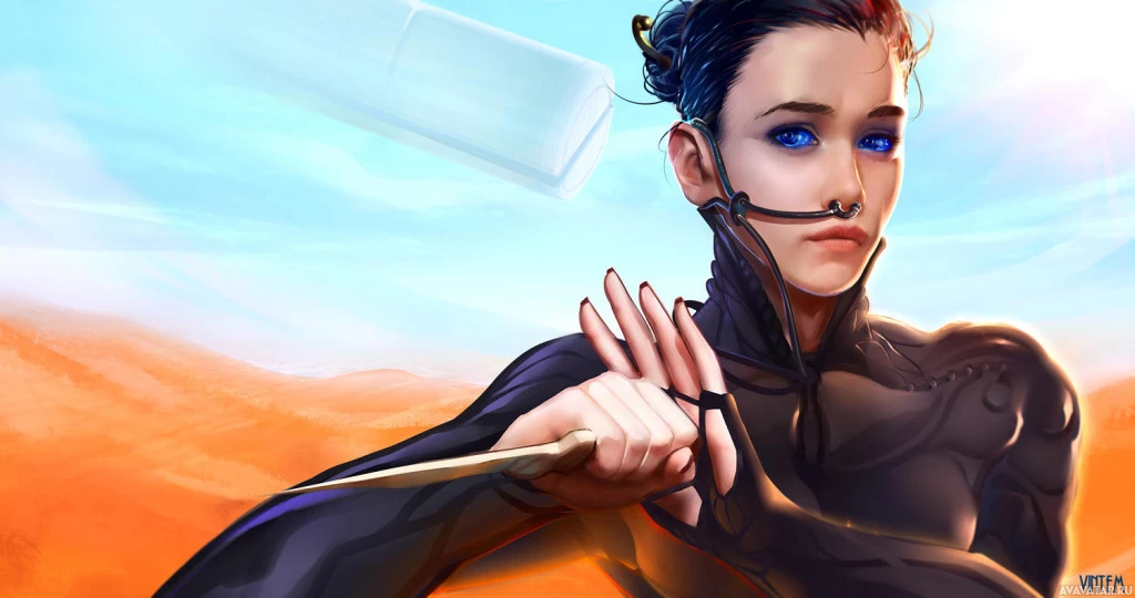 a desert landscape in the background, which could indicate that this scene takes place on another planet, possibly one with harsh environmental conditions. The overall style is illustrative and seems to be inspired by comic book art or