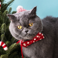 holiday season. Additionally, the cat appears to be wearing a bandana with a pattern of stars and what looks like snowflakes or possibly